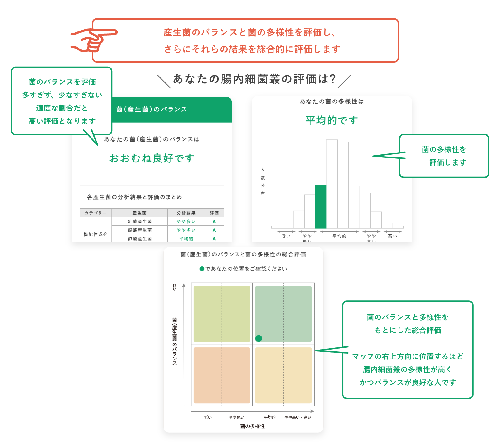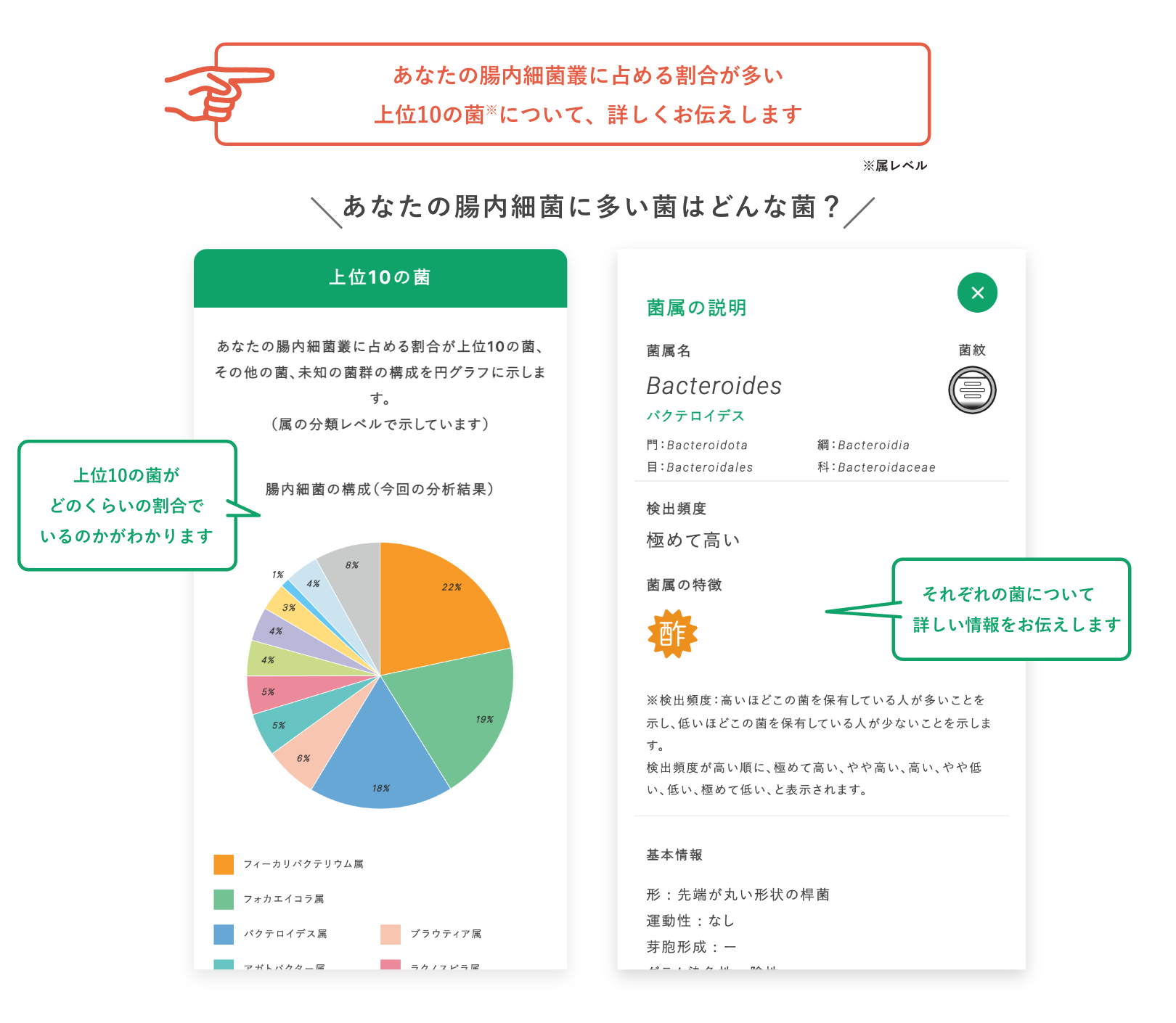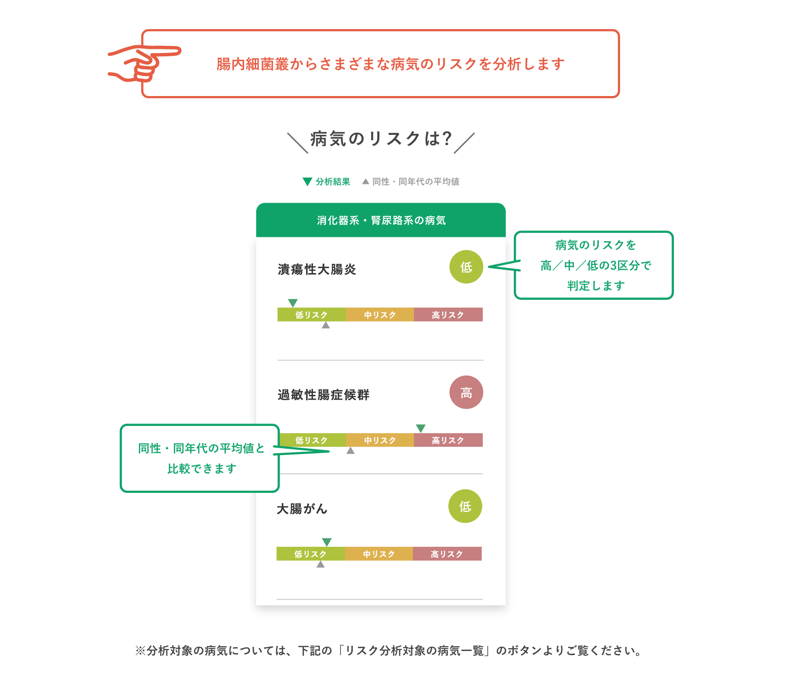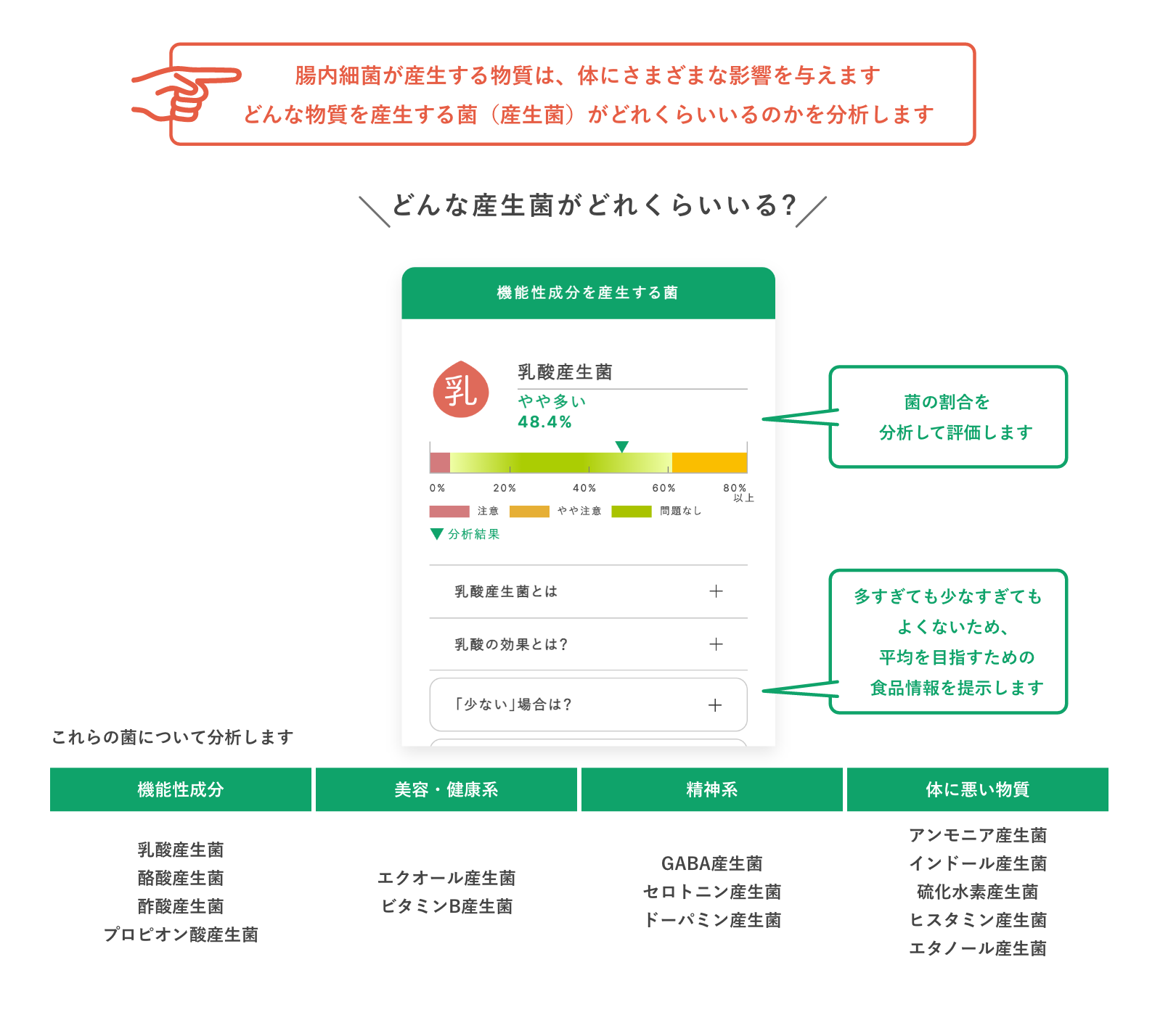 ・単にリスクを提示するだけでなく、あなたの腸内細菌の構成に合わせた「おすすめ食品」をご案内。