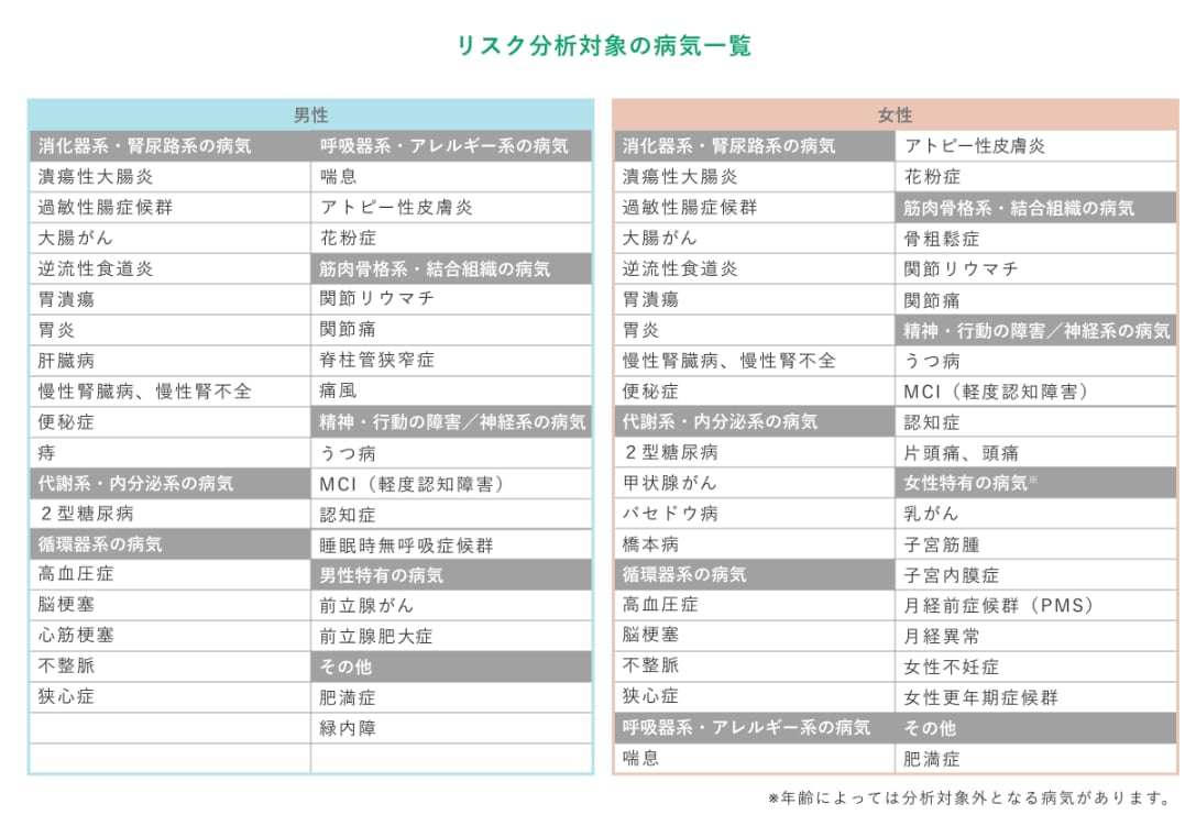 ・女性は34項目、男性は31項目の病気リスクを確率値で算出します。